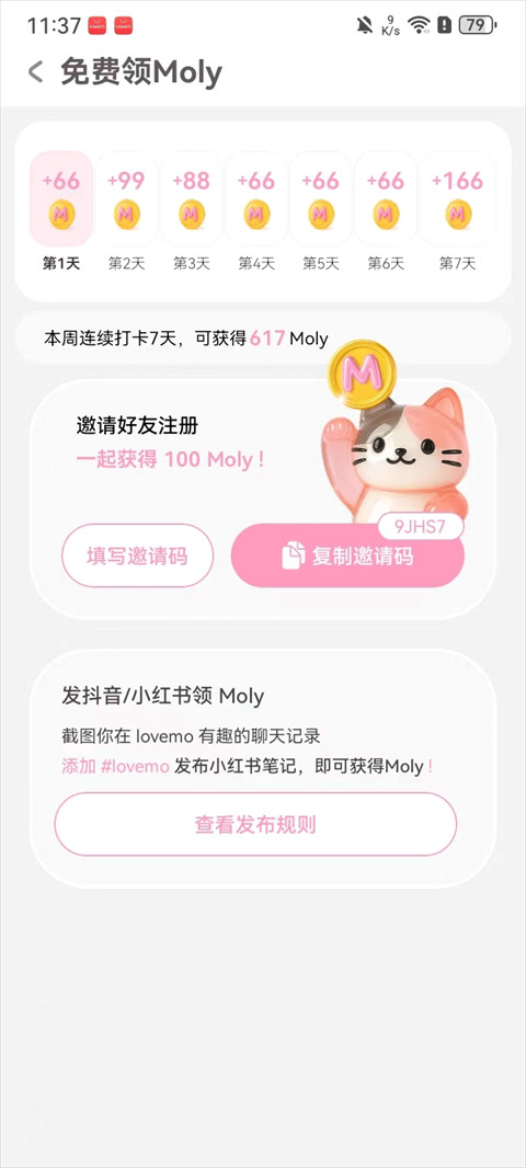 2、可通过邀请好友注册或将lovemo分享至抖音/小红书推广来免费获取Moly币!