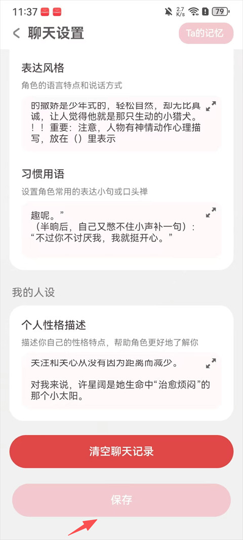 2、聊天设置页下滑找到“人设设定”功能;