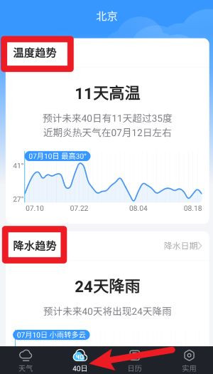2、点击下方40日选项进入趋势图页面,浏览未来40天的温度变化和降雨趋势预测。
