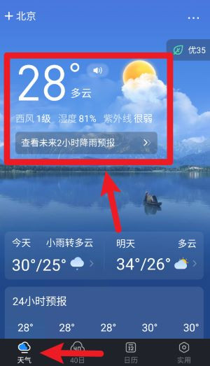 1、打开祥瑞天气,点击底部天气按钮可查看当前城市温度、湿度及未来2小时降雨预报等天气信息。