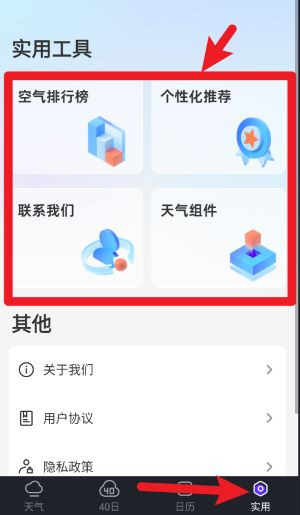 3、点击底部实用标签页可进入工具区,快速访问空气质量排行、天气组件和个性推荐功能。