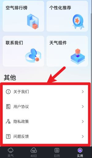 4、在实用页面下方的其他栏目中,可查看关于我们、隐私政策和提交问题反馈入口。
