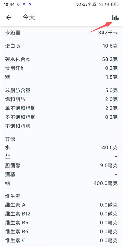 4、接着返回日记页点击总结下方的进食记录就可以查看当天所摄取的营养量;