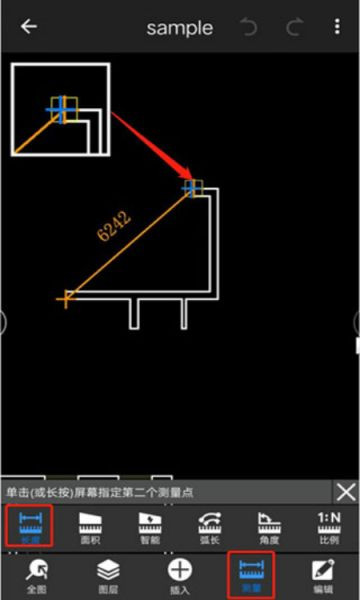 1、下载打开CAD迷你看图,然后在软件上面打开一个CAD文件,两指捏合触摸放大图纸到需要测量的地方,然后点击图纸测距功能。