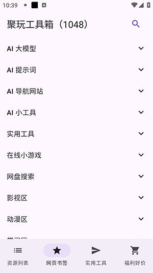 聚玩工具箱是功能全面的实用软件,集资源搜索、网页浏览和多种工具于一体,方便用户快速获取所需内容。聚玩工具箱软件内整合了丰富的网站资源和各类福利信息,涵盖影视、音乐、网盘、图书等多个领域,满足不同需求。聚玩工具箱界面简洁实用,操作方便,致力于为用户提供高效便捷的一站式工具体验。