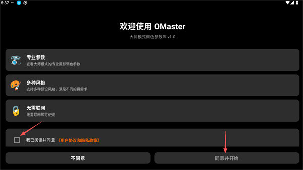 打开进入OMaster相机软件,阅读后点击同意并开始