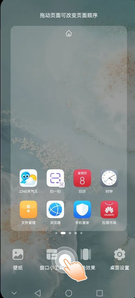 1、在手机桌面长按或者两指长按在屏幕上靠拢来实现,具体方法根据手机不同而操作不同。
