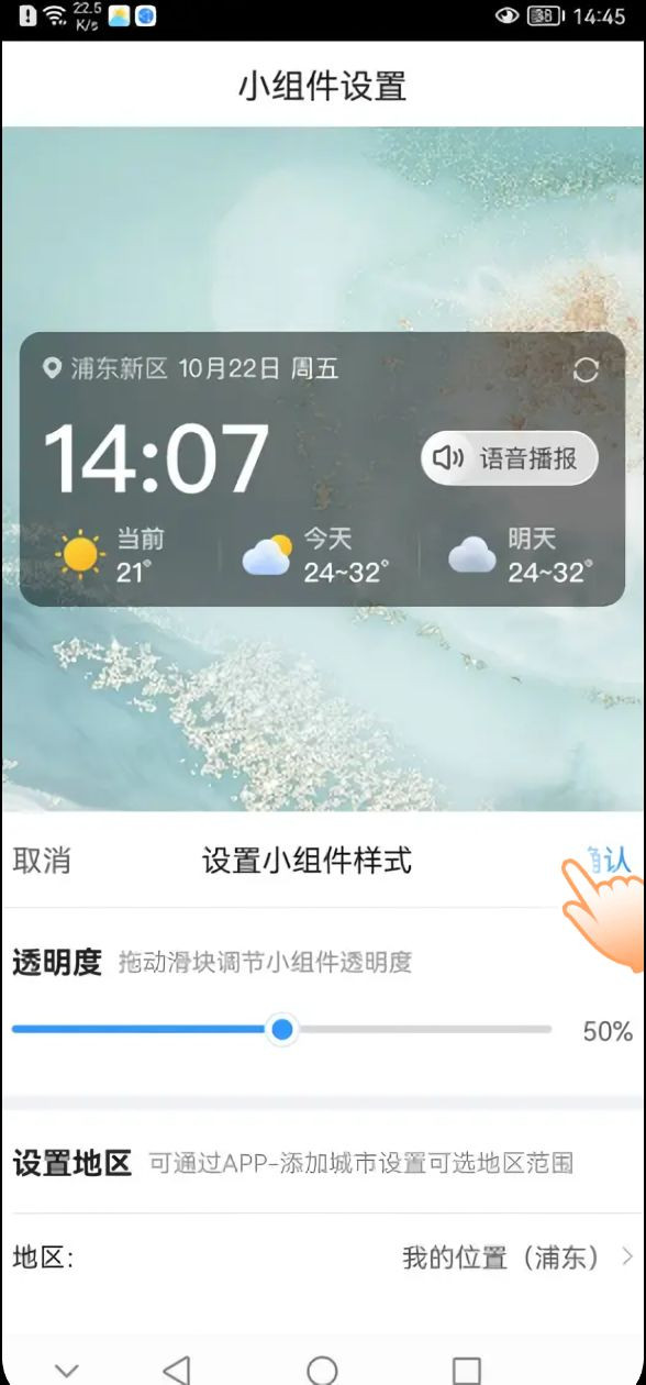 4、然后设置小组件的区域、透明度等;