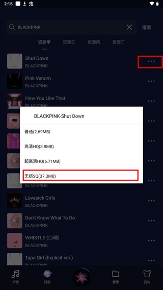 4、若想下载音乐,点击右上角的【...】图标,然后在弹出的选项中选择音质进行下载。