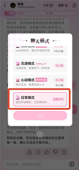 3、滑到最下面可以切换日常模式,免费聊天不会消耗软糖,但是只有100次机会。