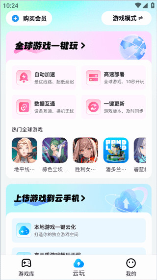 1、我们点击云游侠下面的云玩,点击右上角的游戏模式。