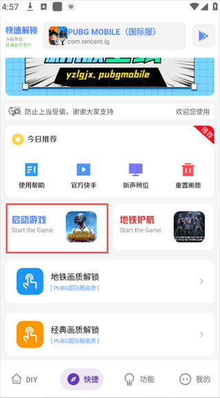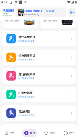 在快捷板块中,您可以一键解锁游戏的核心优化功能,如地铁/经典画质、游戏亮度、陀螺仪、音质等。特别是针对PUBG国际服的专属优化选项。