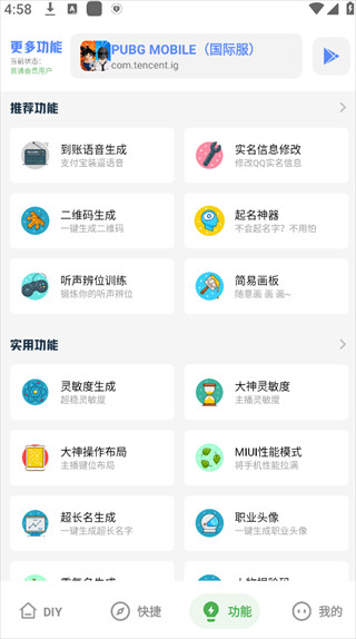 功能板块集合了多个实用的PUBG辅助工具,如灵敏度生成、听声辨位训练、准星DIY等,帮助您提升游戏水平。