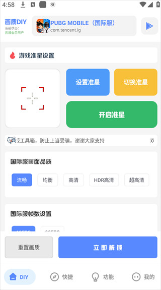 在DIY页面,您可以自定义游戏准星,手动调整国际服的画面品质与帧率,打造属于您的专属游戏体验。