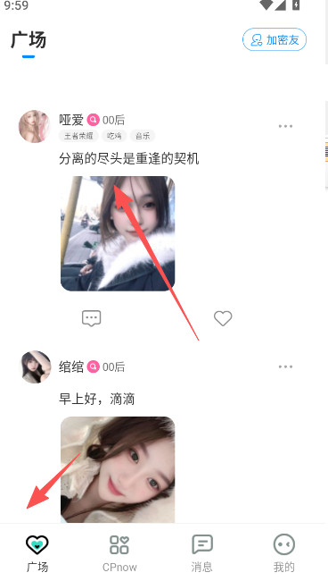 2、广场上,有许多用户在此发布分享照片,可以选择你喜欢的男生女生类型,留言对谈交流。