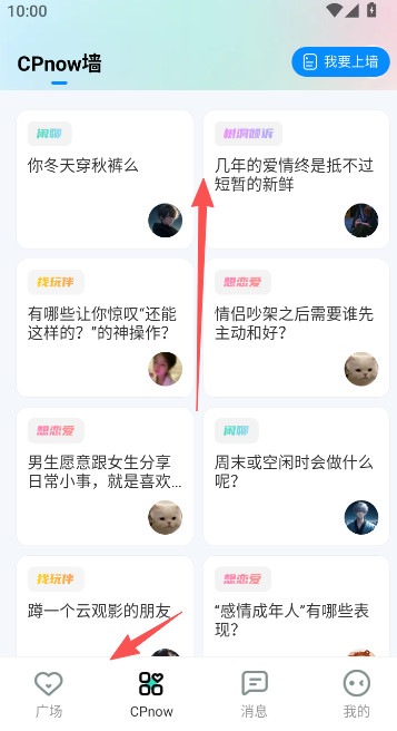 3、萌点CPnow专属上墙,跟校园墙一样,都很多比较有意思的用户分享在此发布,比如一些闲聊话题或是情感倾诉等等。