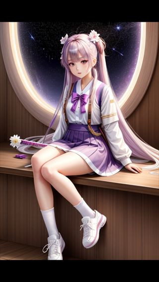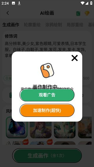 2、在修饰词框内输入自己想要创作的画作形容词,尽量具体一点,比如我们输入:高分辨率、美少女、紫色眼睛、可爱表情、日本学生服、白袜子、白鞋子、发带、发花、发夹、发卡、发饰、拿着剑、长发、二次元、彩色、流星;