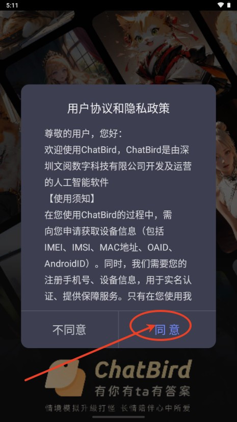 1、在本站下载安装好ChatBird手机版软件,运行软件并同意软件政策。