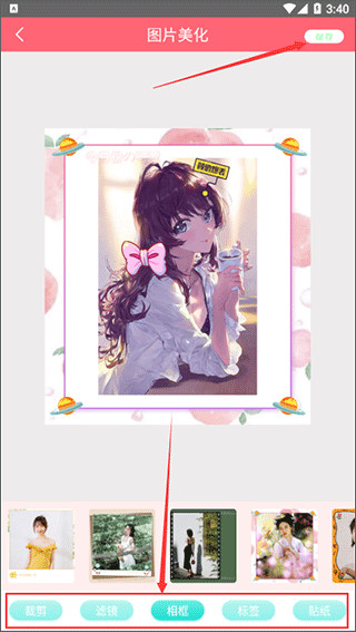 3、在页面底部我们可以选择裁剪、滤镜、相框、标签等等来美化照片,自己觉得满意后点击右上角的保存即可;