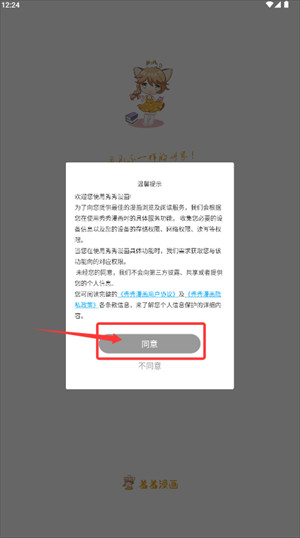 1、启动秀秀漫画阅读应用后,首先出现温馨提醒窗口,轻点“同意”即可继续使用。