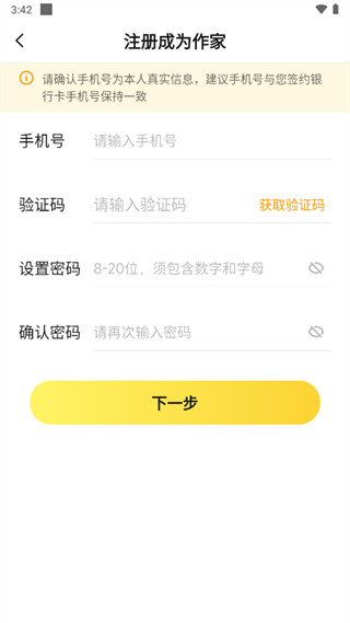 1、先从本站下载好七猫作家助手app,下载完成后,新用户需要使用实名验证的手机号码进行注册登录。