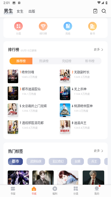 3、排行:男生女生榜单都有,热度榜、新书榜、好评榜、全本榜,发现最热最受欢迎的小说;