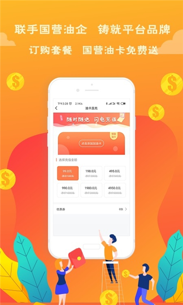 送油卡加油是一款专门为汽车车主所提供的加油服务软件,让我们大家可以享受着更多的优惠,当你加油的时候,你就可以及时的打开这款软件来领取惠券,能够为我们大家节省金钱,再也不用为油价高、油耗高的问题而烦心,使用app为你解决自驾出行后顾之忧,还能选择性开通中国石油加油卡,在任意一家中国石油公司都可以使用加油卡;