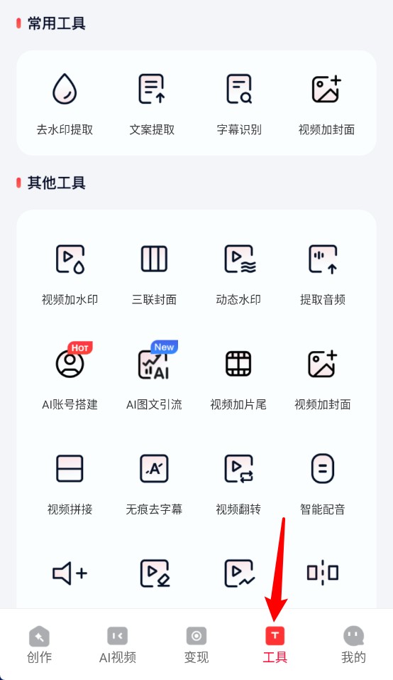4、“工具”页面整合去水印、加封面、提取音频等多种视频处理功能,满足多场景的剪辑需求。