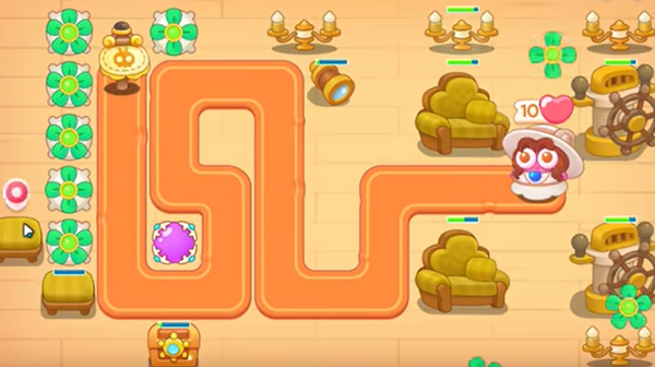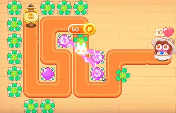 2、接着在地图上障碍物被清除一部分后,按图在地图左侧沿道路放置风扇塔和一个魔法球来增加火力,攻击敌人。