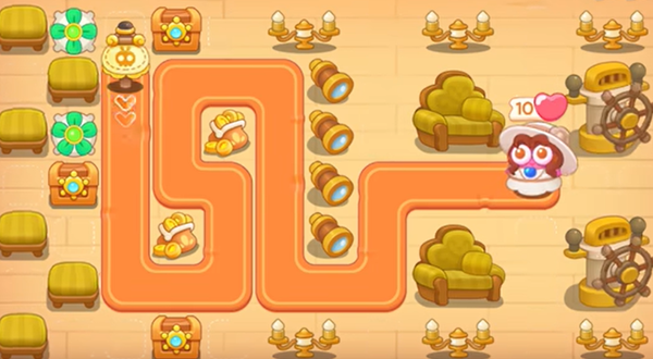 1、首先玩家进入地图后,地图左上方会赠送有一个风扇塔,我们在这个上方再放置一个风扇塔,两个都升至满级来清除前期的敌人和障碍物。