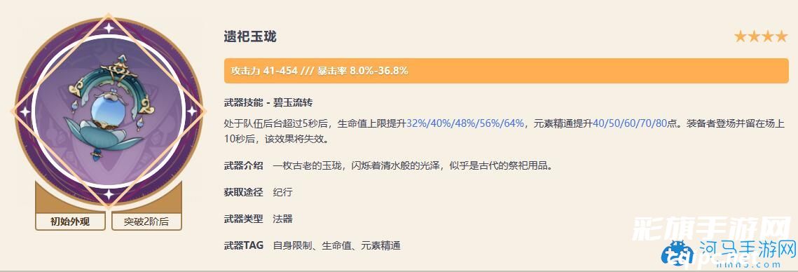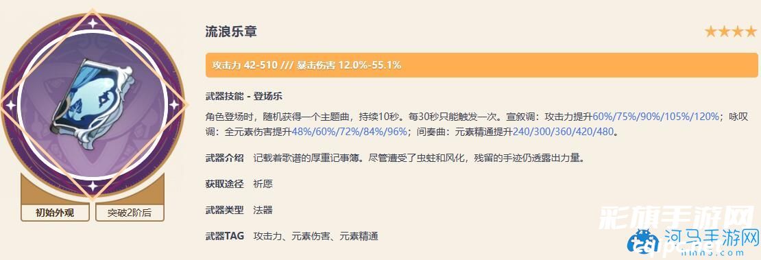 这个武器可以说是四星武器当中的佼佼者了,提供了55爆伤不说,还能够提高玩家的元素伤害、攻击力或者是精通,运气好的话提升元素伤害的话,那么对于玩家伤害的提升是可以直追专武的,甚至攒满精的情况下是要高于专武的,不过这个武器的缺陷也是很明显的,就是真空期比较长。