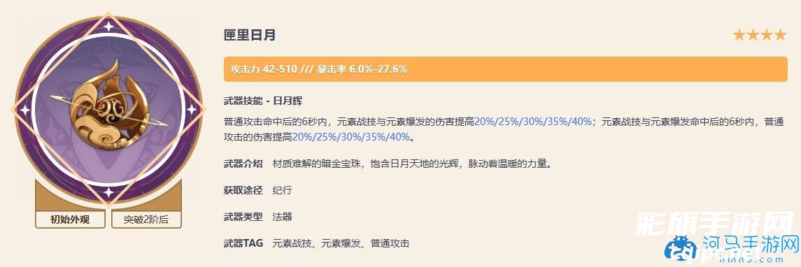 匣里日月就是大月卡法器,这个法器的副词条能够提高角色的爆率,让玩家能够更加轻松的堆出比较高的面板,从而打出较高的伤害。并且技能词条还能够提高玩家普攻和重击的伤害,对于玩家伤害的提升还是很明显的,满精之后甚至能够直接提高40%的普攻以及重击伤害,还是非常值得一带的。