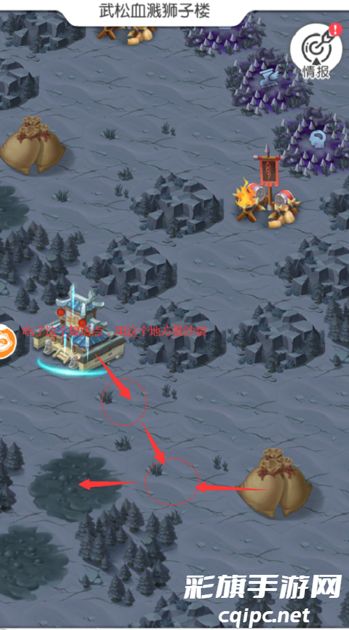 4、右下邛哥哥的证言,首先右下推沙袋,然后右推沙袋,报销怪。 这时,两个沙袋被记录为A和B 。 推一个到左边树周围的中间,再推一个到右边泥潭清算伤口,拿到证词。
