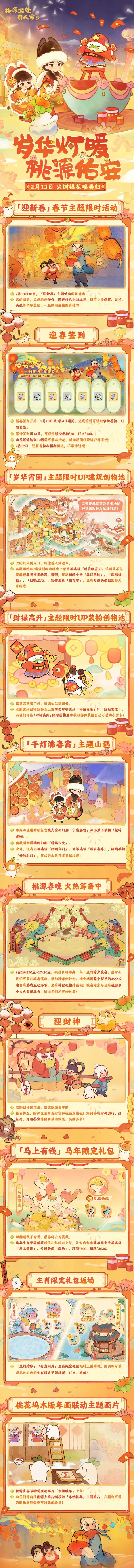 《桃源深处有人家》在2026年2月5日(昨日)发布了版本前瞻内容!全新春节版本「岁华灯暖 桃源佑安」将于2月13日开启!彩旗小编会带玩家们往下去看看春节版本更新的内容,感兴趣了解的玩家也可以一起来看看吧!