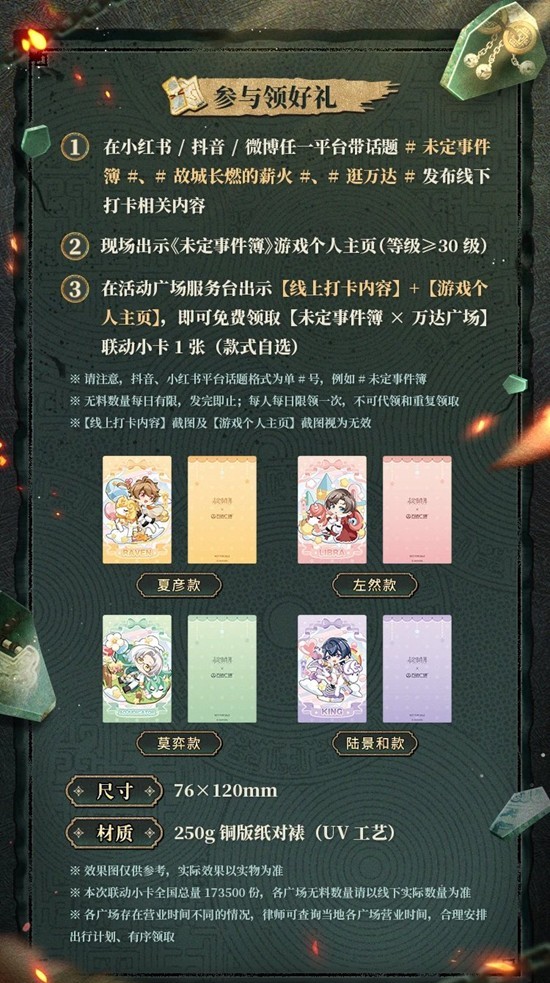 3、活动规则:发布线下打卡相关内容并带#未定事件簿##故城长燃的薪火##逛万达#发布至小红书/抖音/微博任一平台,到活动广场服务台出示相关打卡内容与游戏主页(等级≥30级),即可领取联动小卡1张(款式自选)