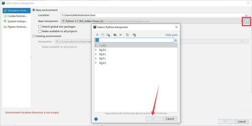 4、在弹出来的窗口中,继续点击base interpreter后面的省略号按钮,选择Python3.7所在位置,确定后点击OK按钮。