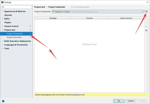 3、点击project下的project interpreter,可以看到当前编译器为Python2.7,点击右上角的小齿轮按钮,选择add。