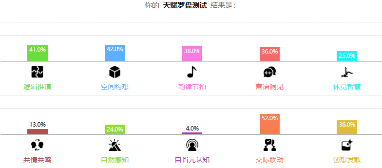 1、天赋罗盘测试基于多元智力理论与现代心理学研究,从逻辑推演、空间构想、韵律节拍、言语洞见、体觉智慧、共情共鸣、自然感知、自省元认知、交际联动到创想发散,全面覆盖十大核心天赋维度。通过26道精心设计的题目和科学专业的算法,你将更清晰地理解自己与生俱来的天赋特质。
