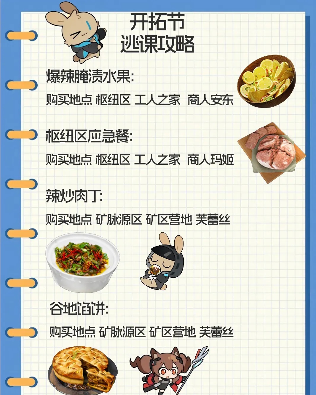 在《明日方舟终末地》中,开拓节是一个全新的活动,玩家参与「开拓节与特色美食」任务,提交特色美食,即可领取对应奖励。那么开拓节第一天要哪些食物呢?下面彩旗小编会带来明日方舟终末地开拓节第一天逃课玩法的资讯给大家参考。