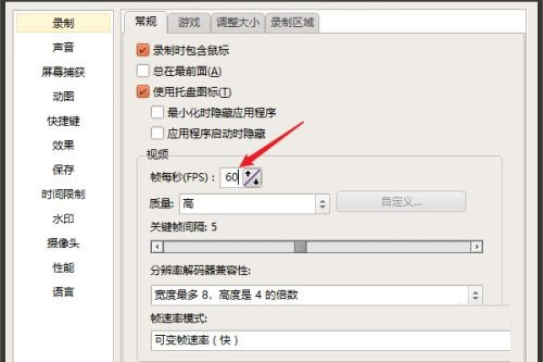 4、将"视频"下方的"帧每秒"改为"60",这样录制的视频看起来会更加的流畅。