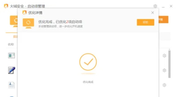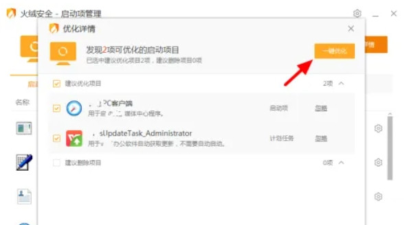5、点击 【一键优化】,火绒会自动禁用不必要的自启动项。也可以手动关闭单个软件的自启动(点击右侧开关)。
