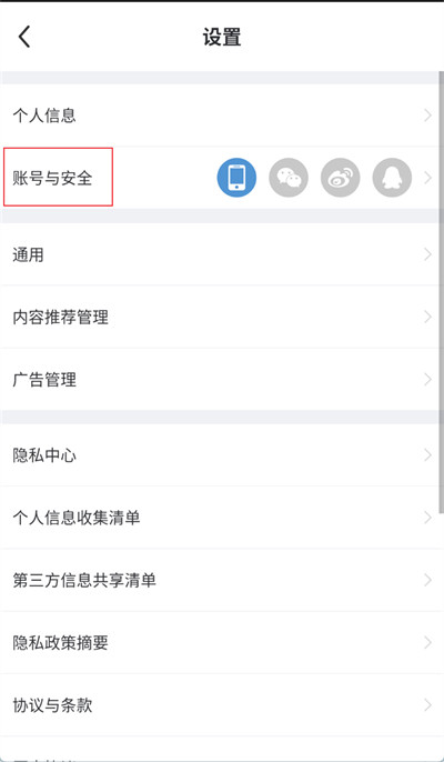 3、之后进入设置功能界面,在这里点击【账号与安全】选项。
